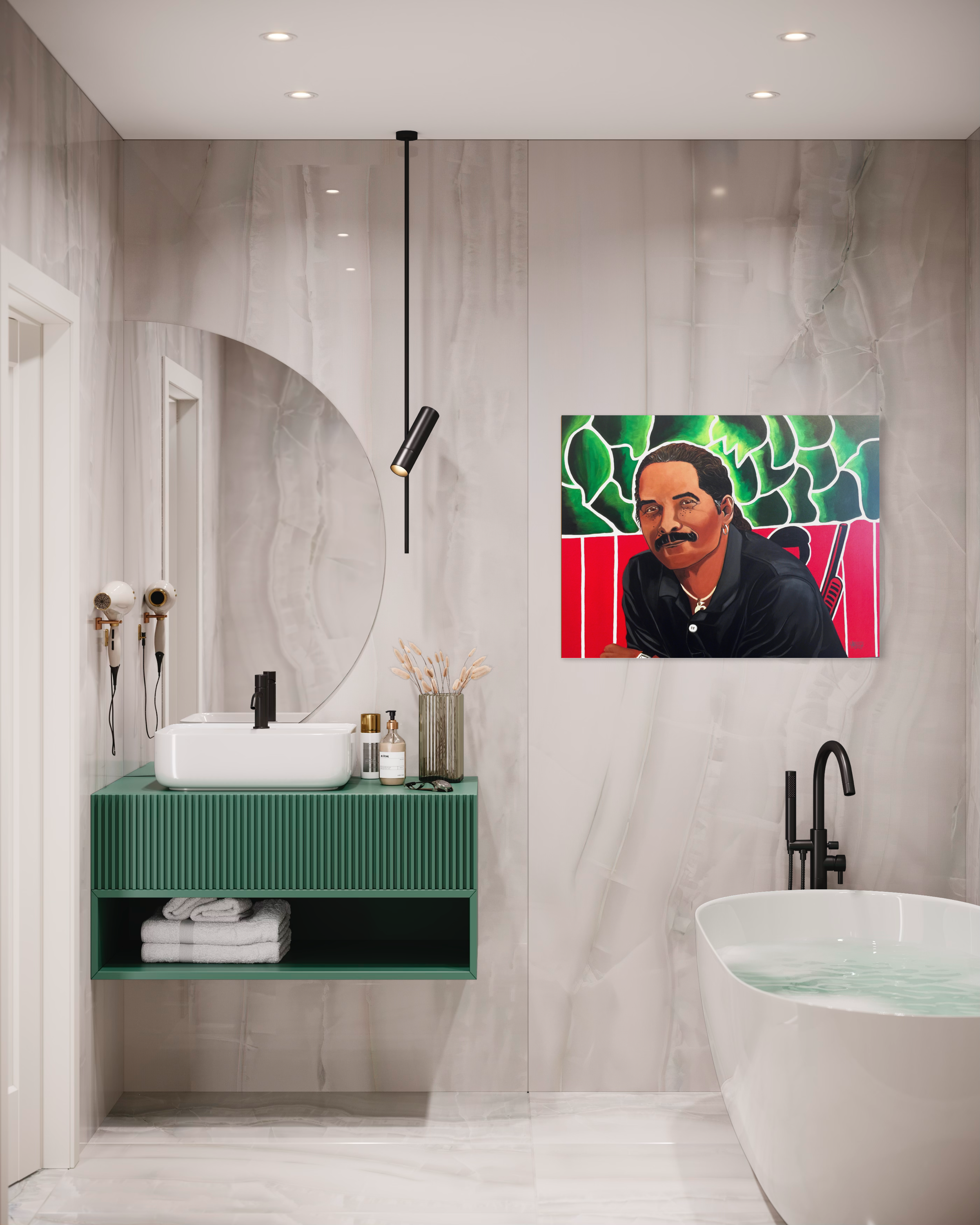 I painted Aaron with a backdrop of a silhouette of a BPP man wearing a black beret holding a rifle, painted on a red fence behind him. In the portrait, he’s 69, and the BPP is no longer operational. This painting is reminiscent of yesterday and depicts who he is today.